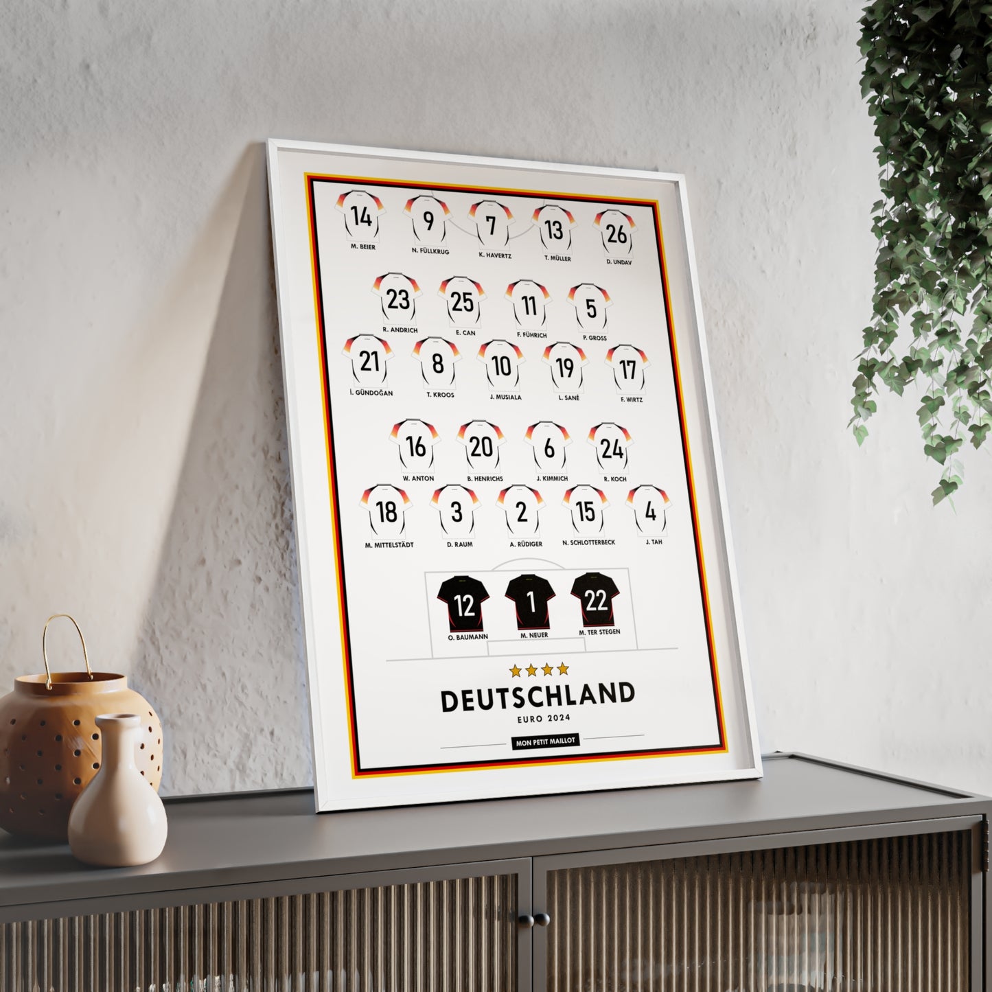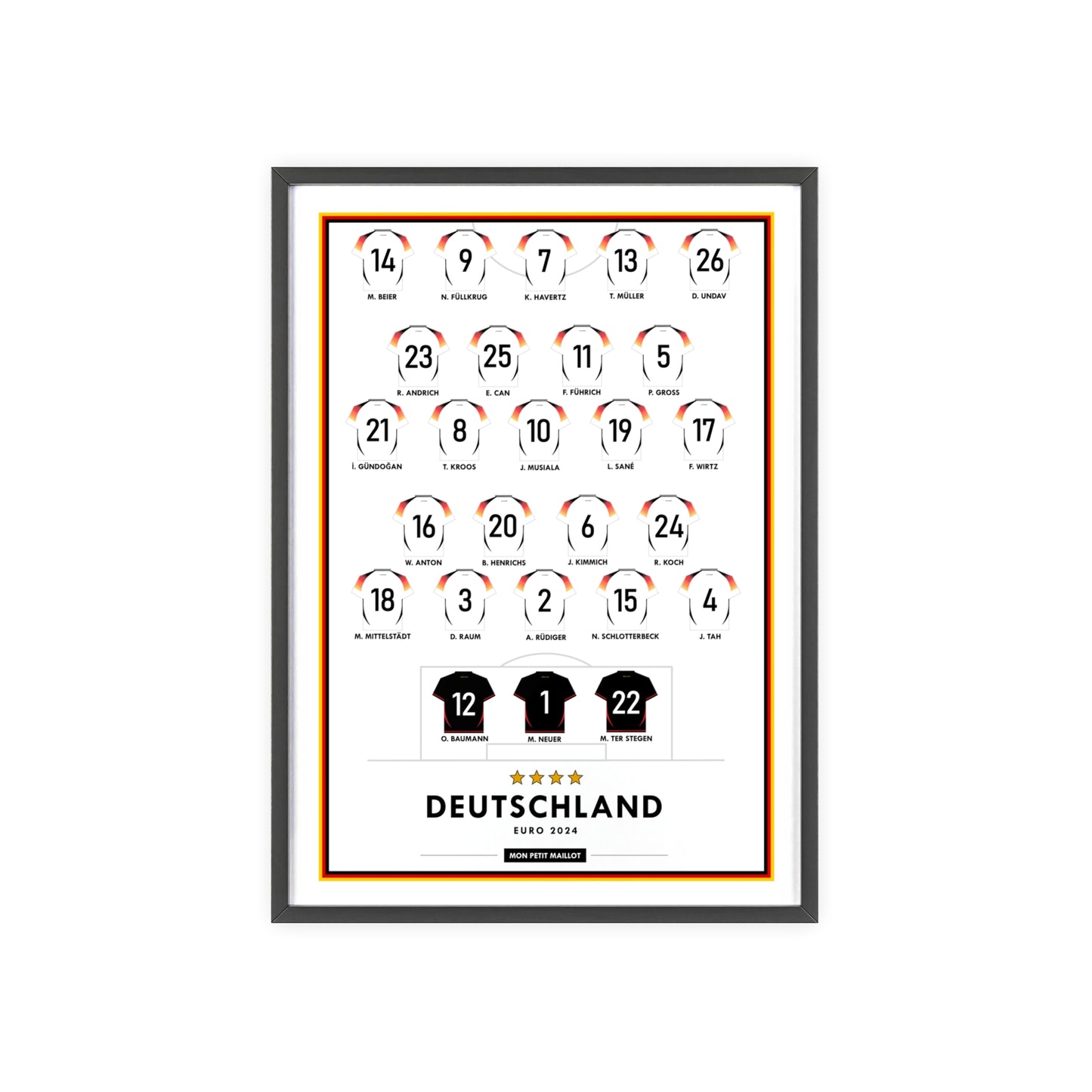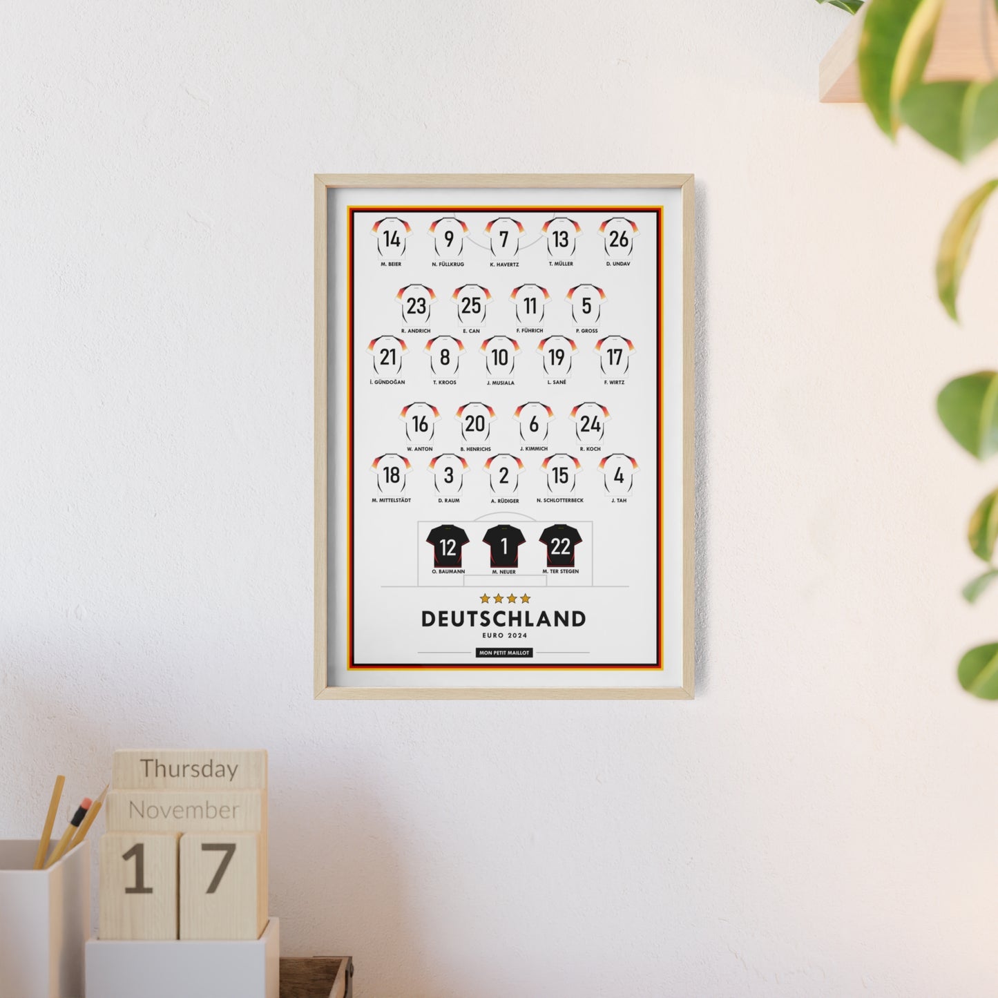 Sublimez votre pièce avec notre poster encadré de l'équipe d'Allemagne, personnalisé aux couleurs de la Mannschaft pour l'EURO 2024.