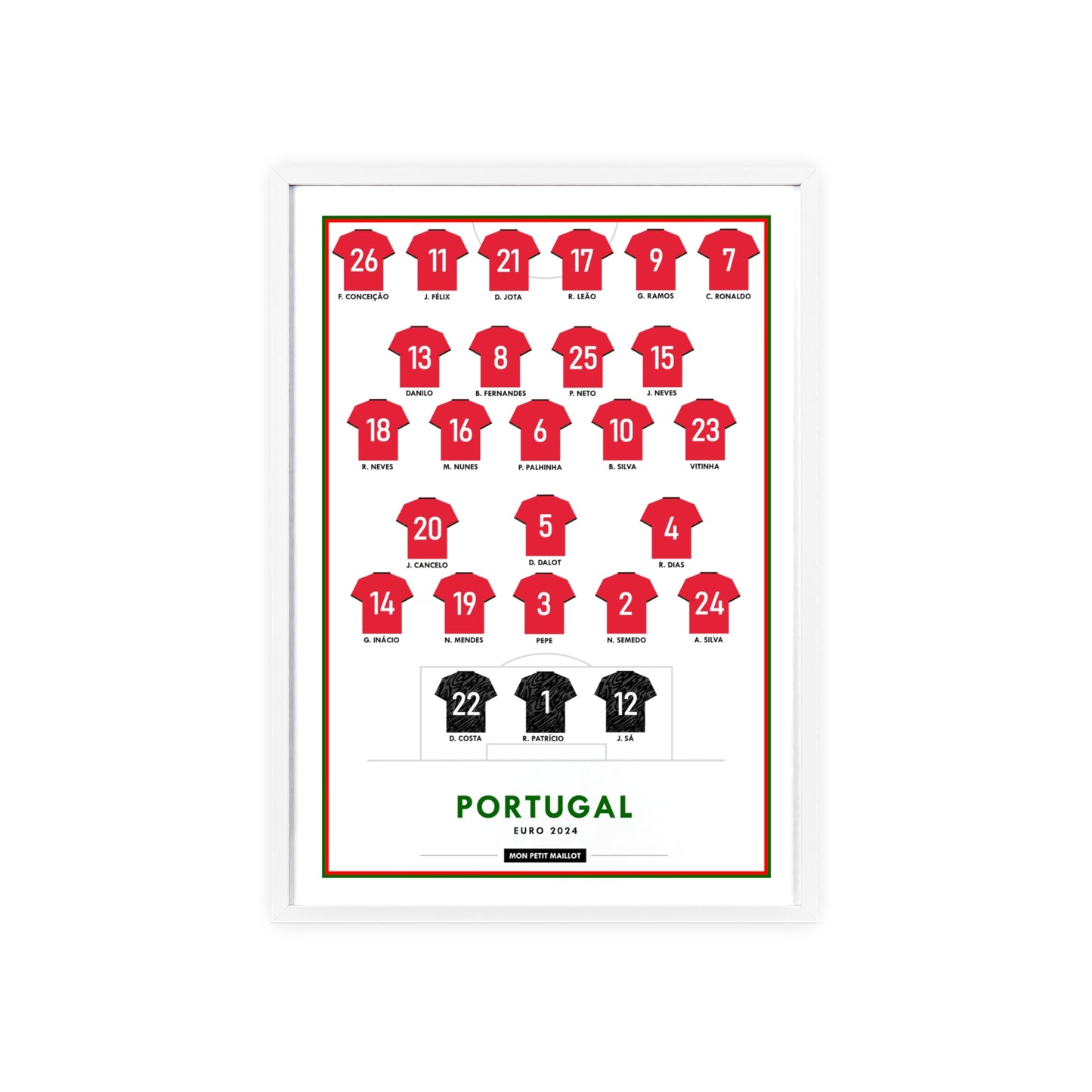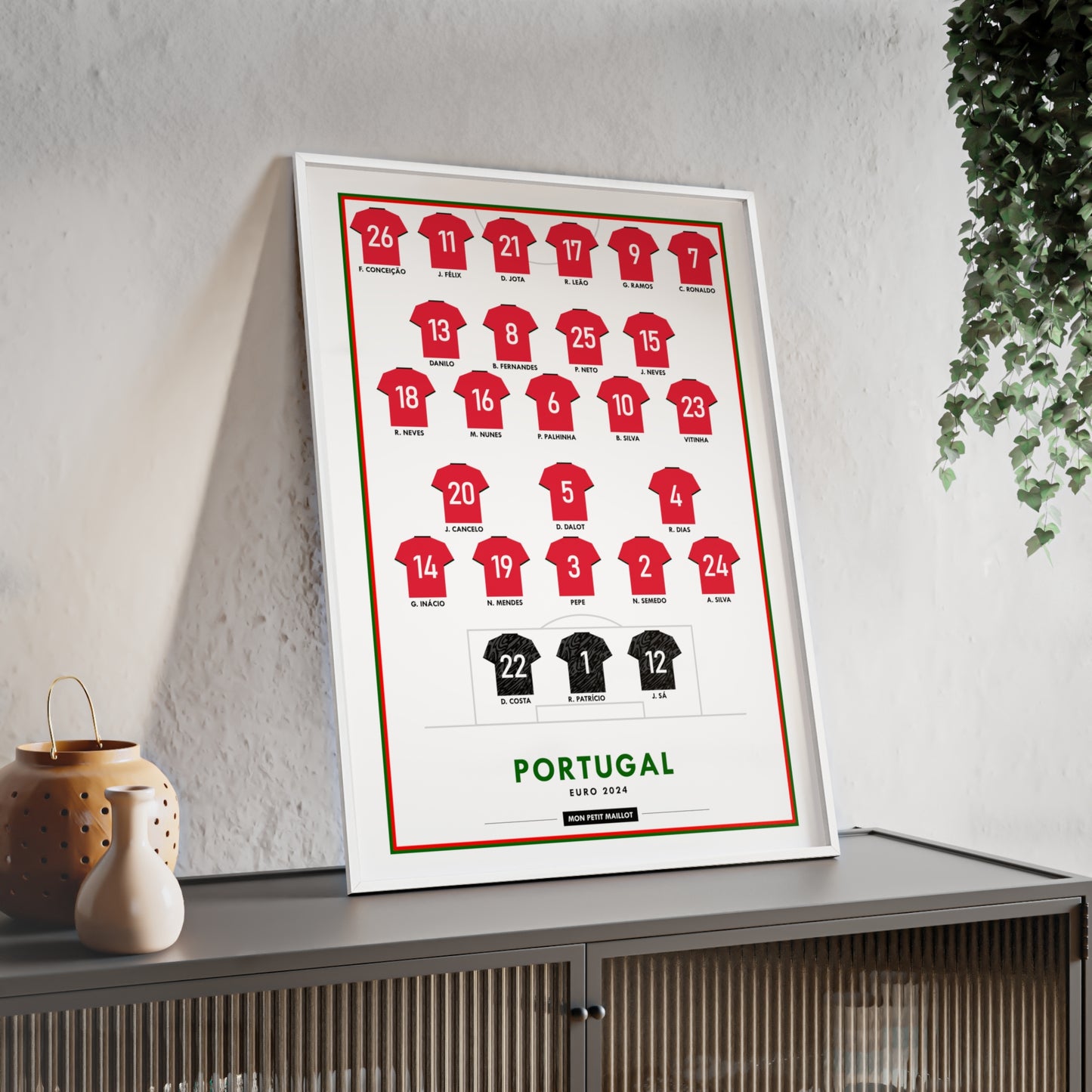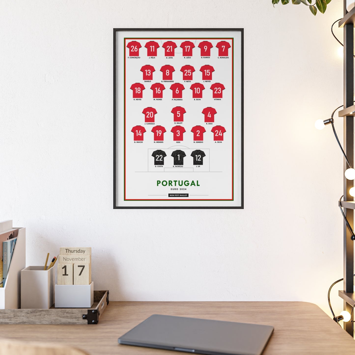 Sublimez votre pièce avec notre poster encadré de l'équipe du Portugal, personnalisé aux couleurs de la Seleção pour l'EURO 2024.