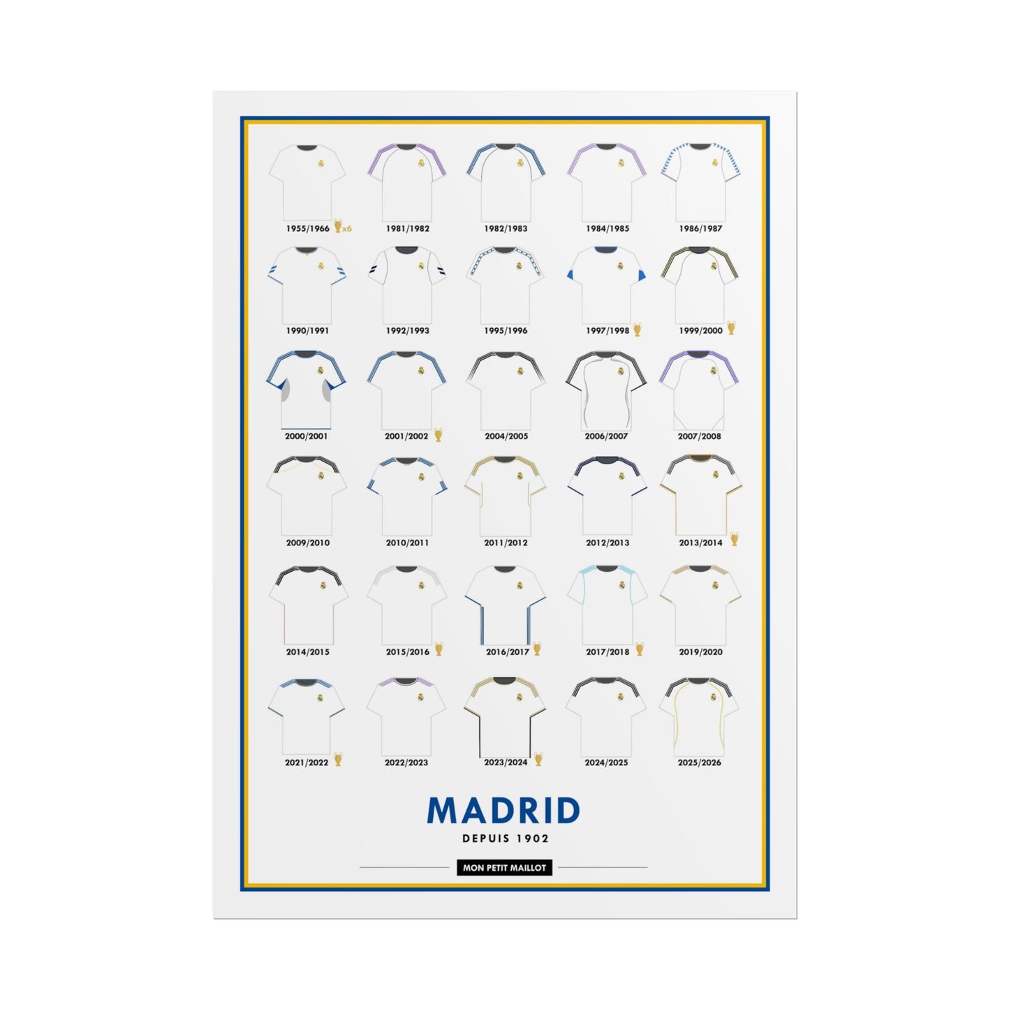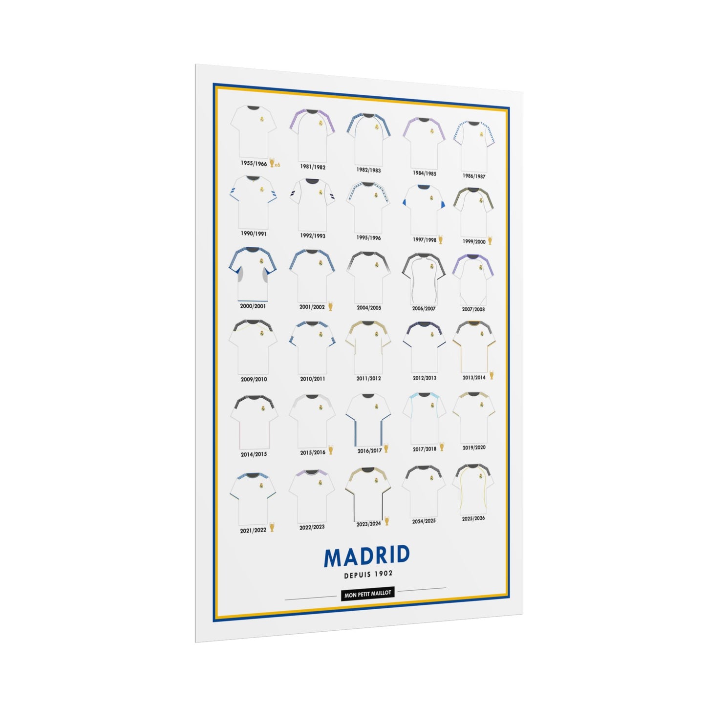 Offrez à votre décoration un hommage vibrant à Madrid avec cette affiche football exclusive, disponible uniquement chez Mon Petit Maillot. Ce poster football Madrid est plus qu'un simple élément décoratif, c’est un véritable manifeste de votre passion pour le club.